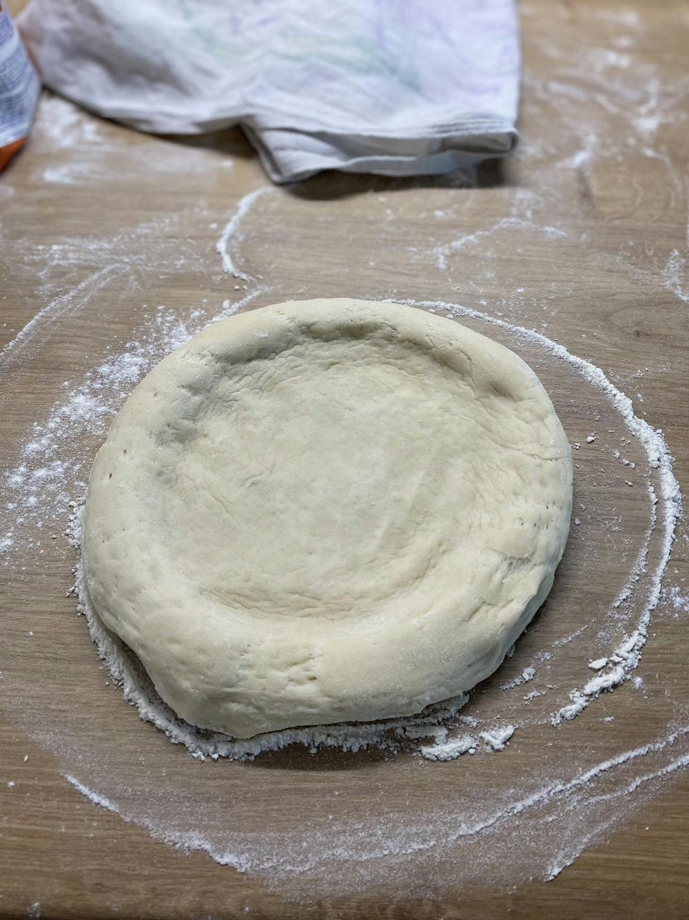 - Kiedy ciasto wyrośnie, weź jedną porcję i uformuj rękoma okrągły placek. Przygnieć lekko środek, ale nie zgniataj końcówek (jak na zdjęciu), a następnie kolistymi ruchami doprowadzić ciasto do odpowiedniego kształtu.