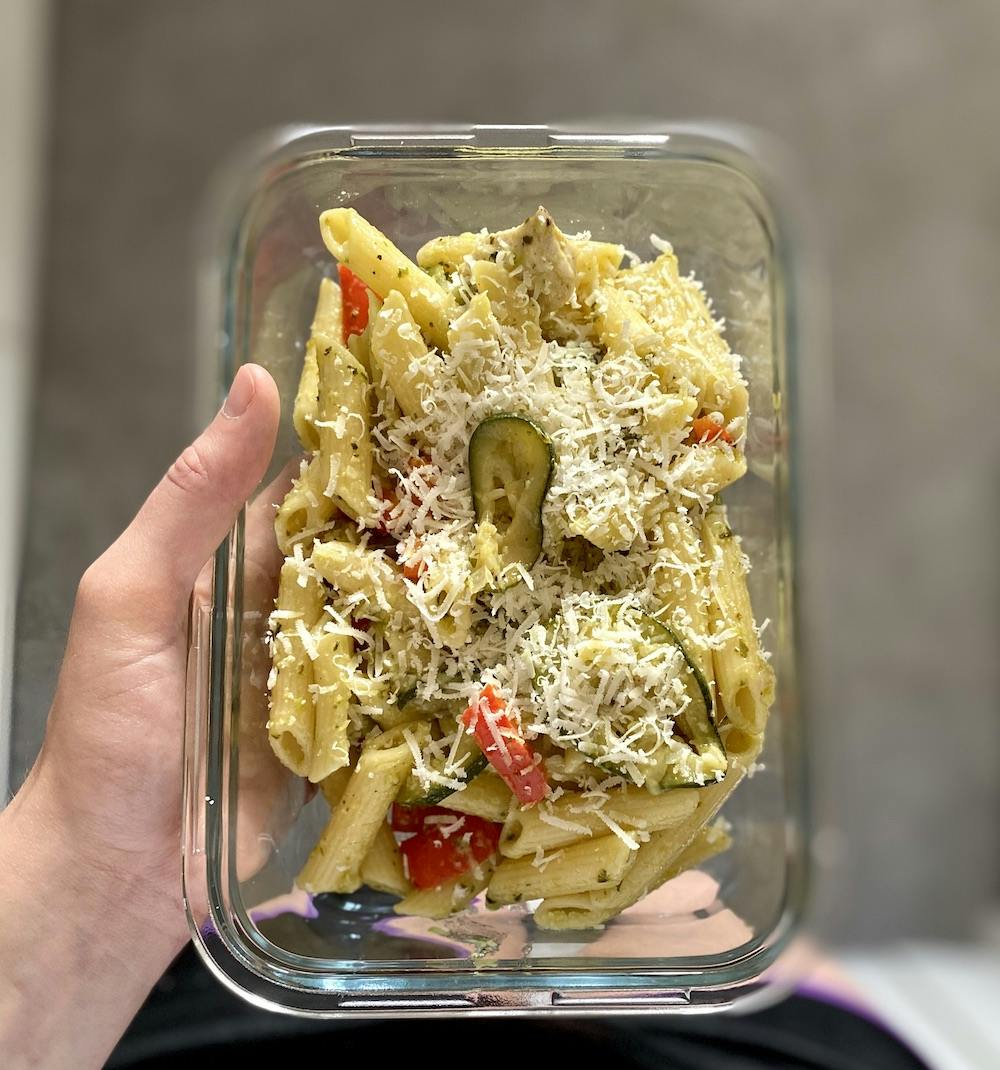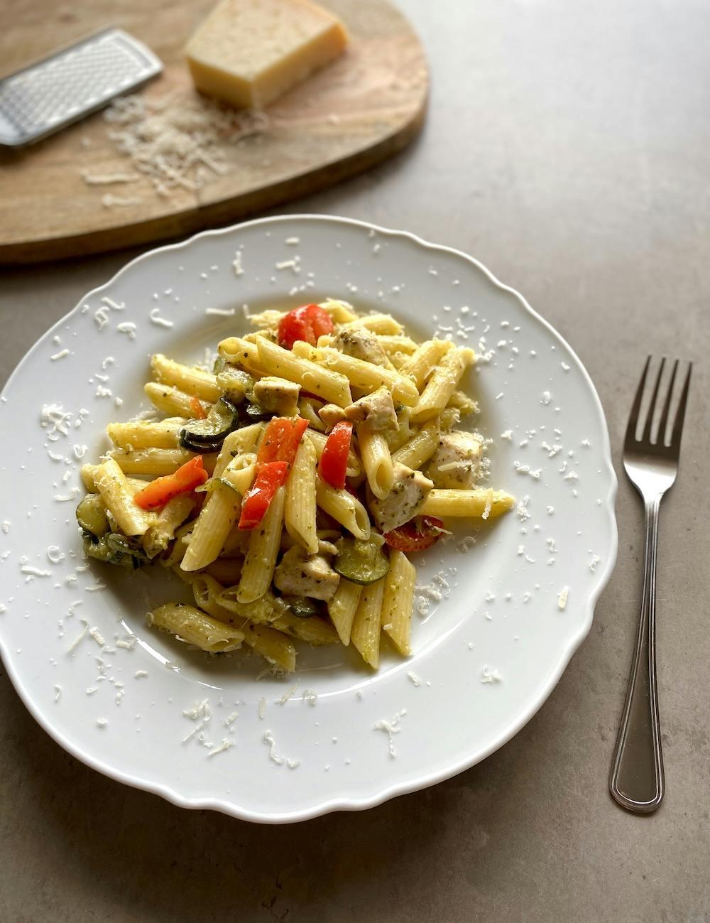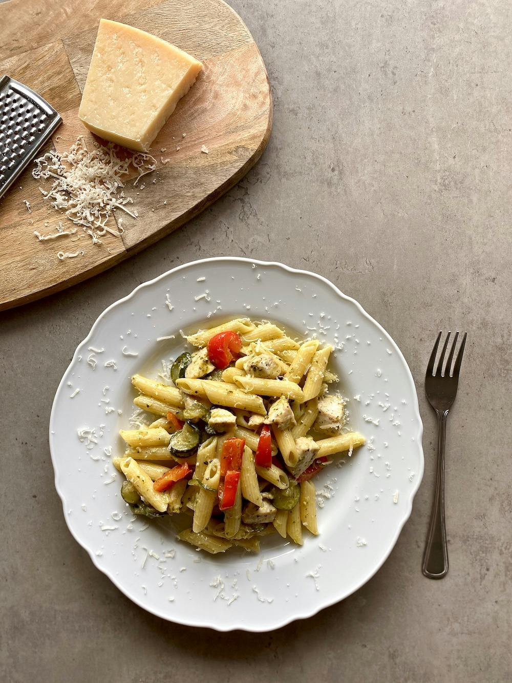 - Ugotowany makaron wymieszaj z warzywami, kurczakiem i pesto.