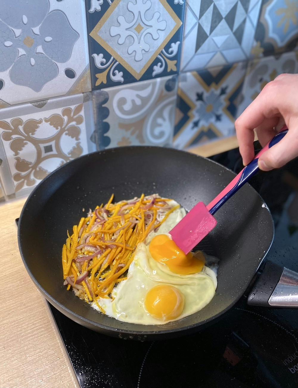 - Zawartość woka przesuń na jedną połowę, a na drugą wbij jajka (jak na zdjęciu). Poczekaj, aż białko trochę się zetnie i dopiero wtedy zacznij mieszać. Mają przypominać jajecznicę. W międzyczasie dodaj kurę i krewetki. Całość wymieszaj z jajkiem.