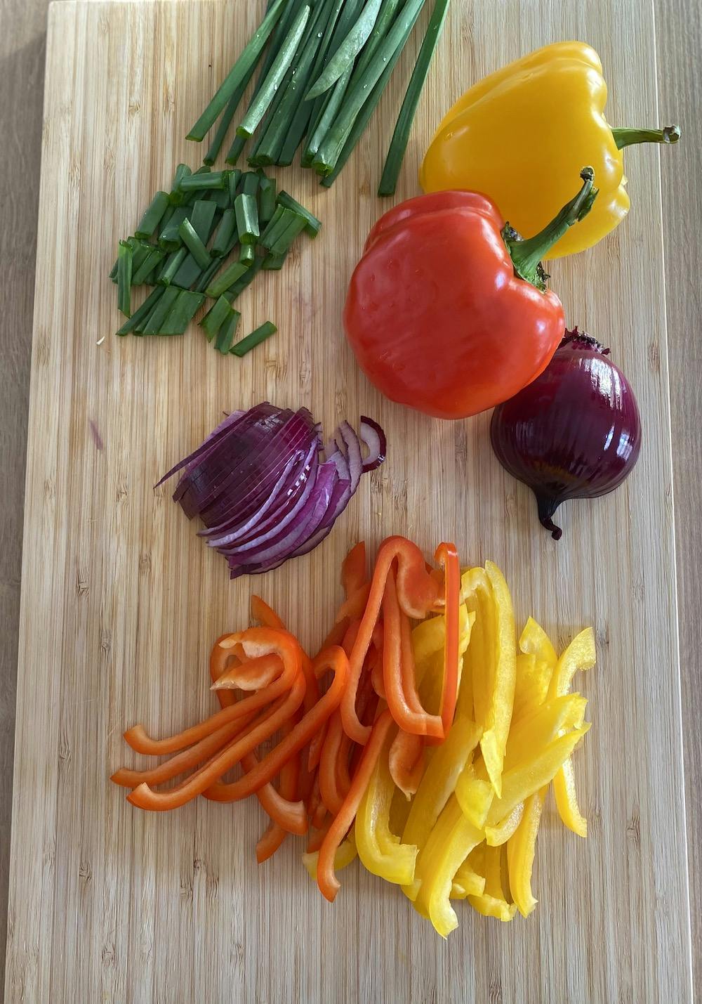 - Cebulę i paprykę pokrój w paski. Czosnek drobno posiekaj.