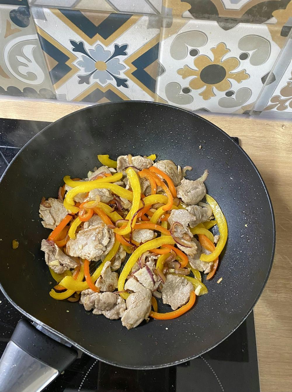 - Polędwicę pokrój na cienkie plasterki i usmaż na mocno rozgrzanym oleju na woku. Gotowe mięso odstaw na bok i oczyść woka.