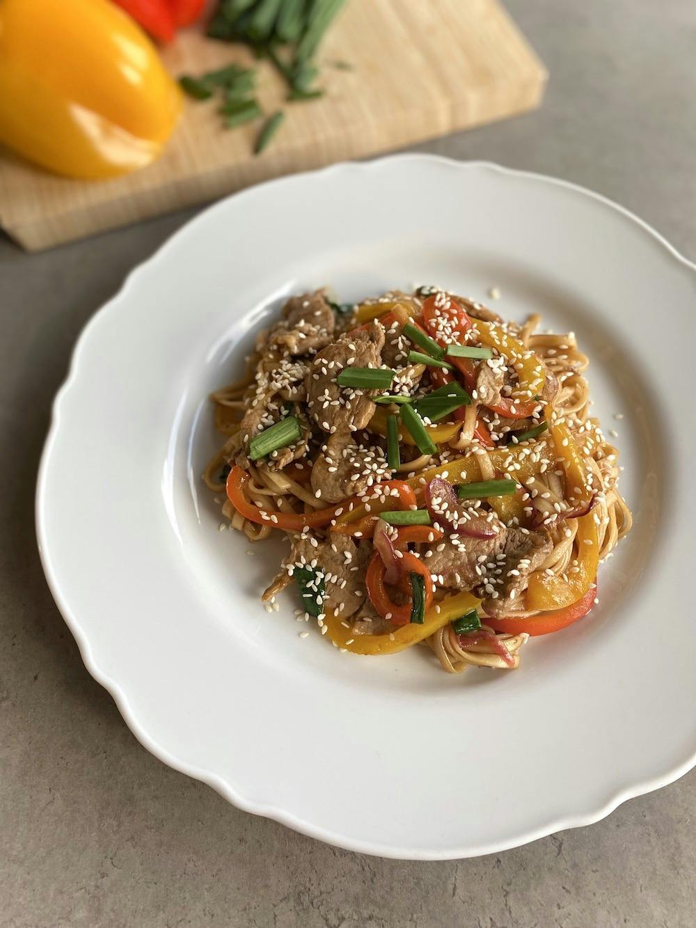 Makaron udon z warzywami i wieprzowiną w słodko-kwaśnym, tajskim sosie. Szybkie w przygotowaniu danie o orientalnym smaku. Posiłek może znaleźć się w diecie: w tężyczce, redukcyjnej, bezlaktozowej.