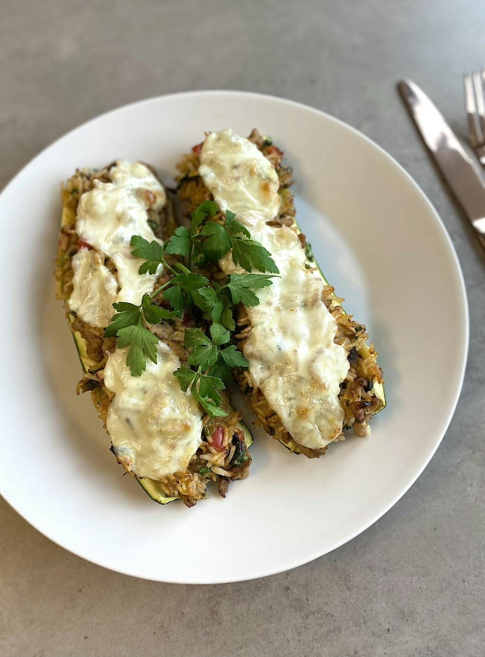 - Cukinię wyłóż przygotowanym farszem i nałóż plastry mozzarelli.