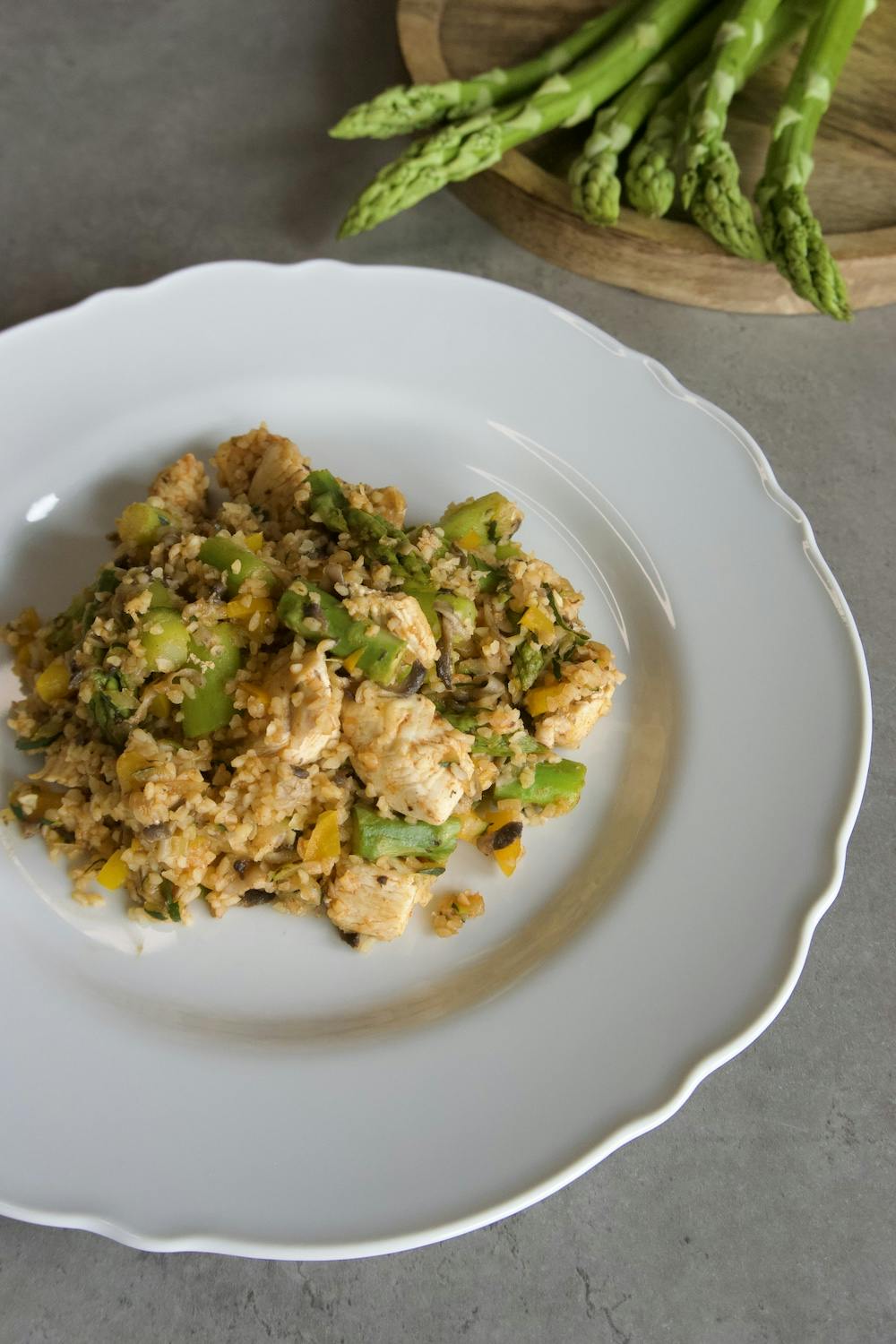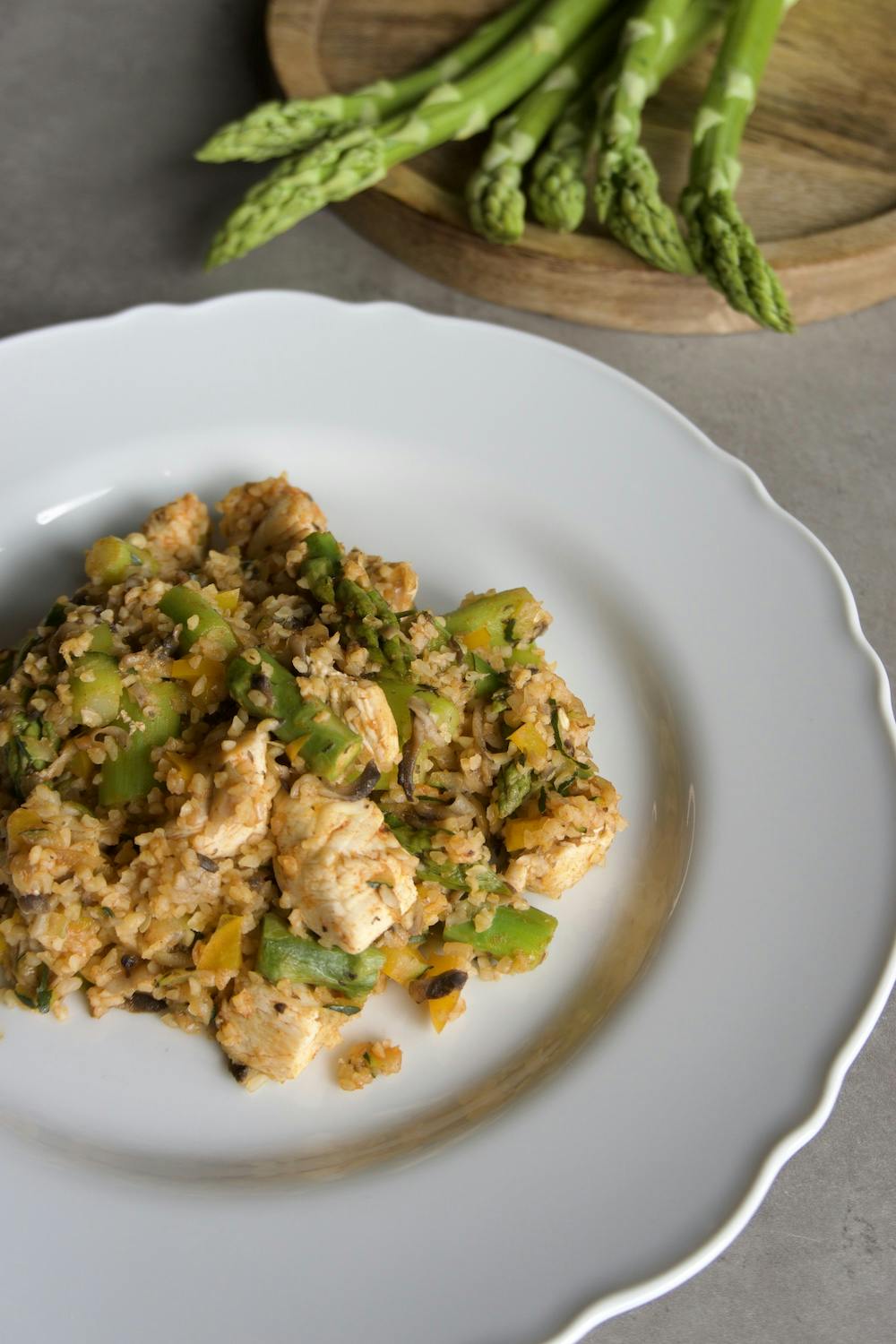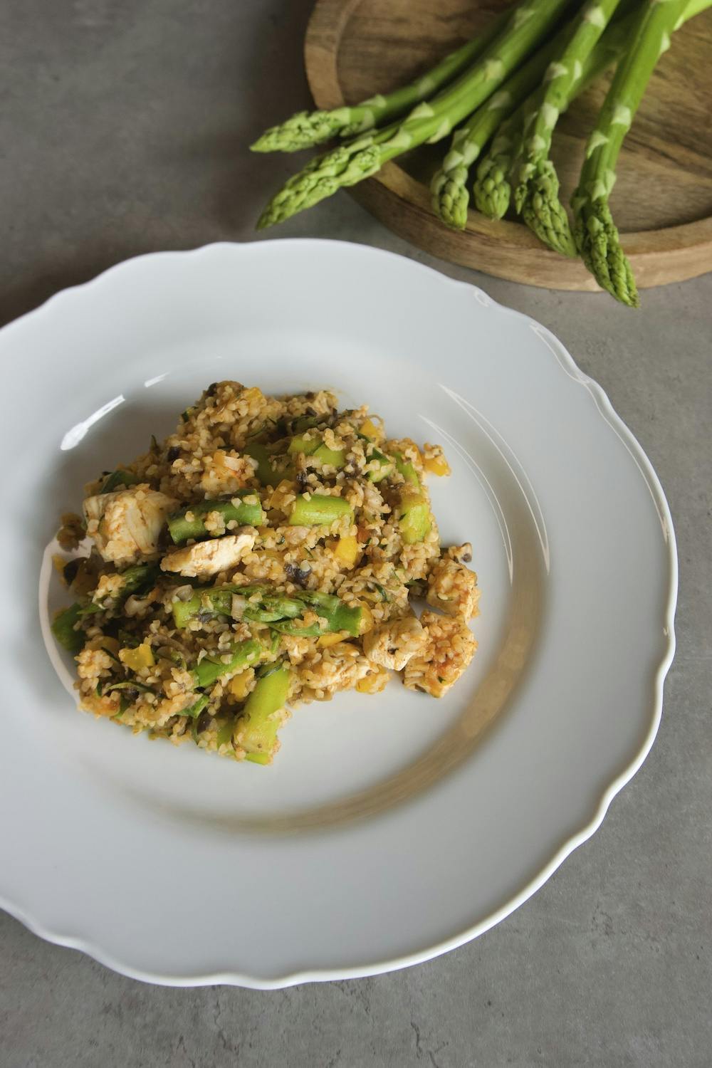 Pomysł na lekki i sycący wiosenny obiad ze szparagami. Kaszę w smaku urozmaicają warzywa, a przyprawy dodają wyrazistości. Danie jest szybkie i proste w przygotowaniu. Nada się jako obiad do pudełka, podany na ciepło lub zimno. Posiłek może znaleźć się w diecie: w ciąży, w tężyczce, w cukrzycy, redukcyjnej, bezlaktozowej oraz przy nadciśnieniu tętniczym.