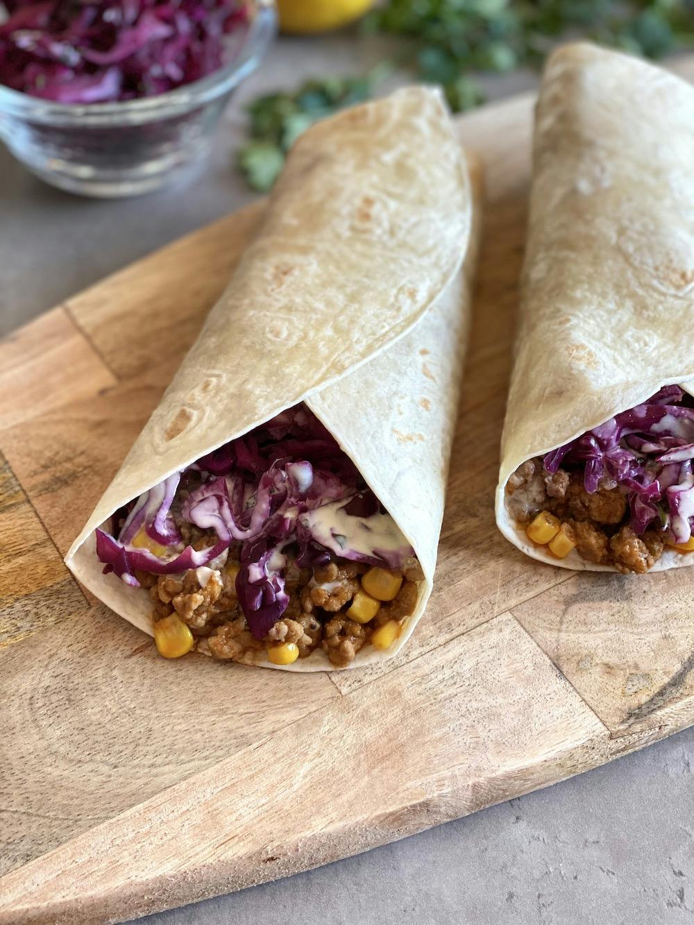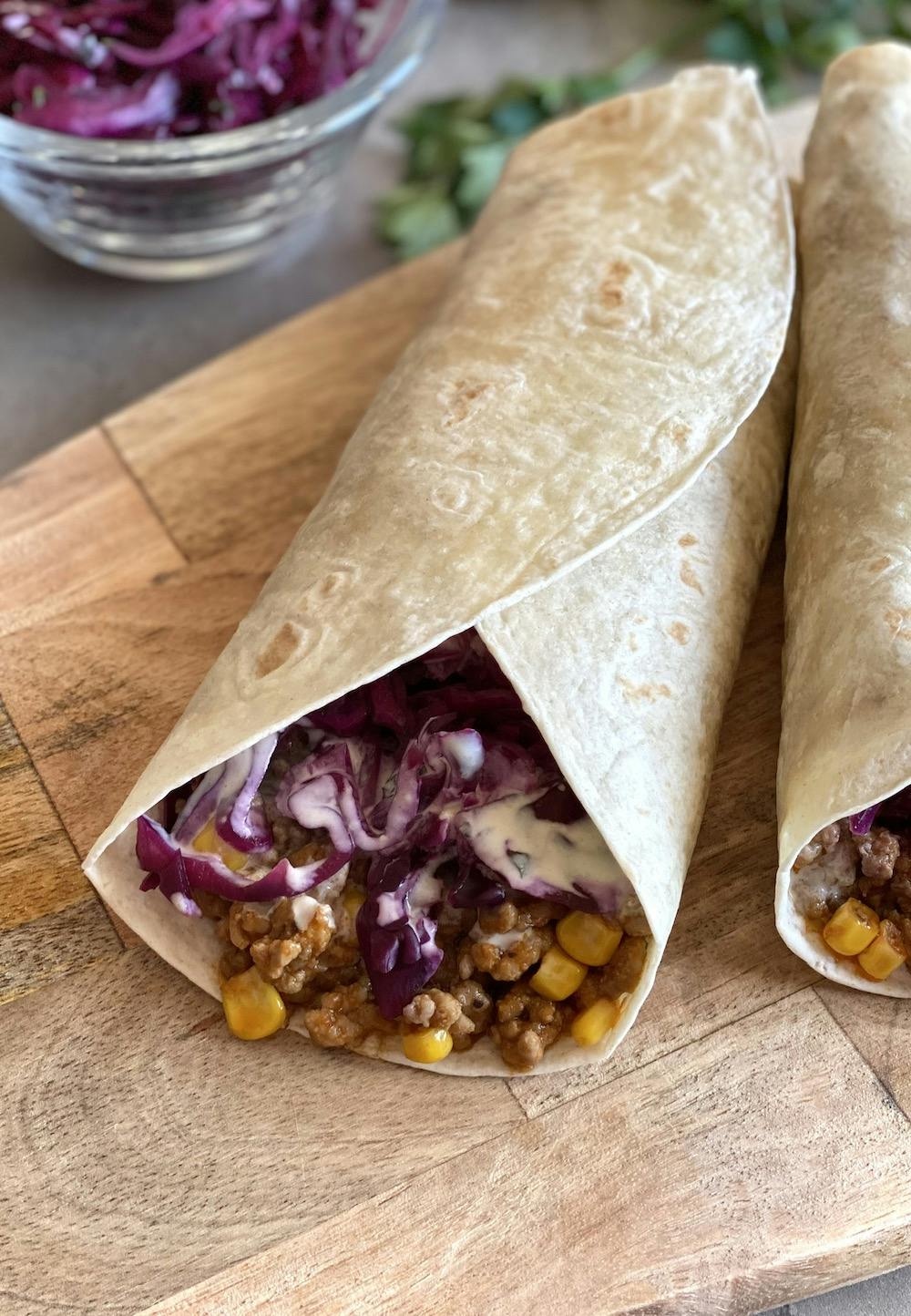 - Na ciepłą tortillę nałóż mięso, surówkę, polej sosem i zwiń.