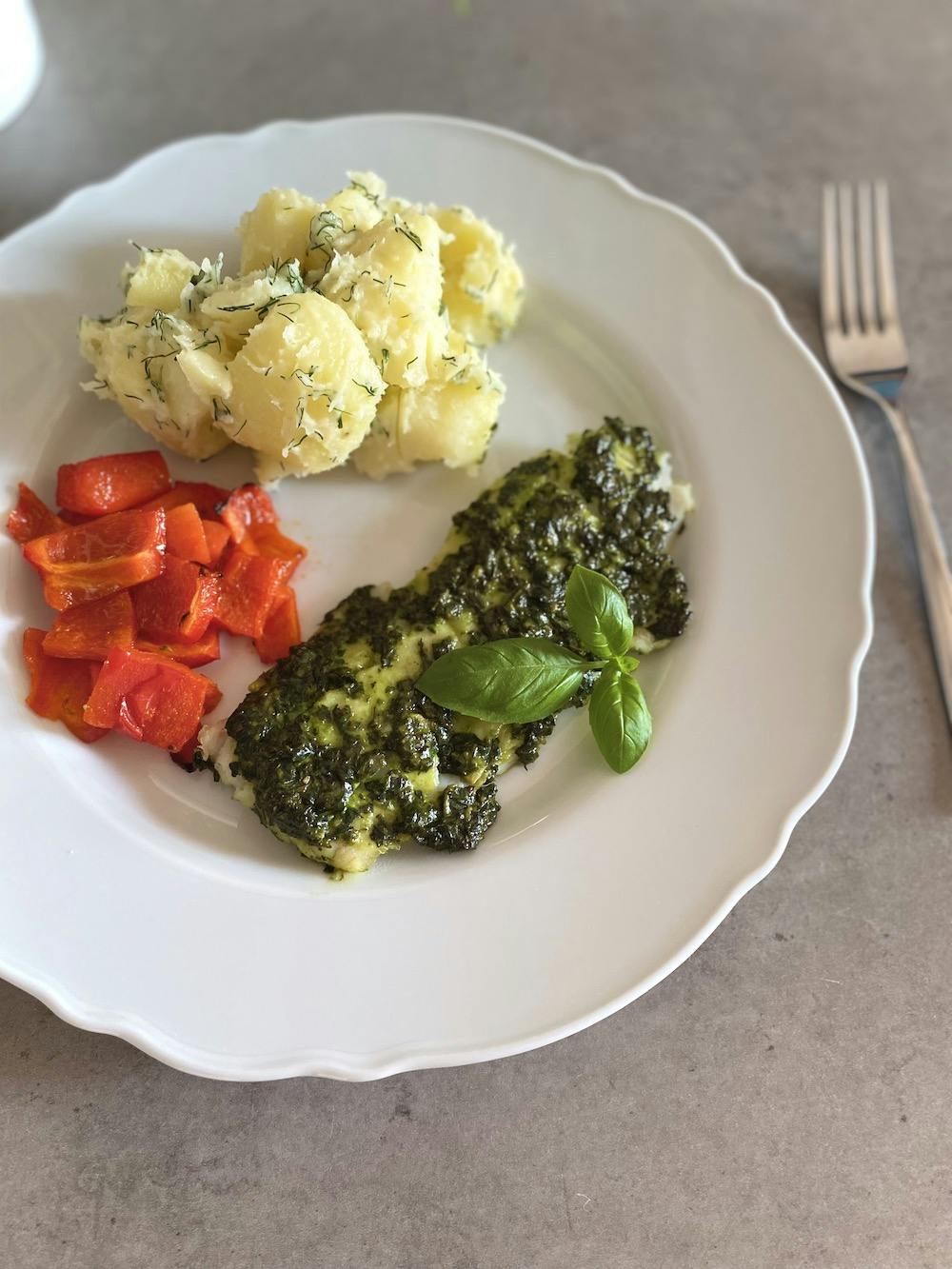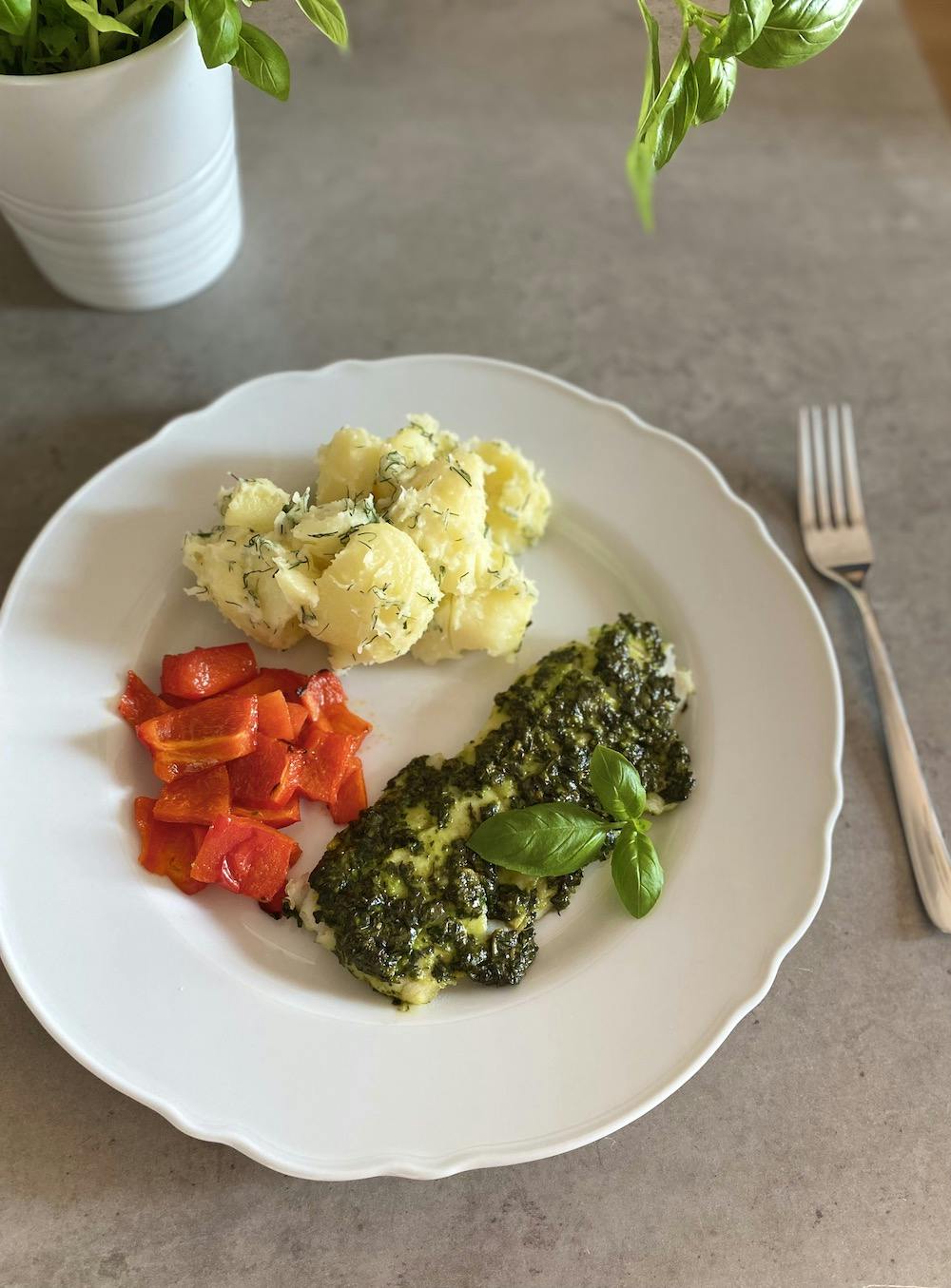 Delikatna i soczysta ryba o wyrazistym smaku zielonego pesto z bazylii z nutą cytryny. Idealnym dodatkiem i przełamaniem słonego smaku pesto jest słodka, pieczona czerwona papryka. Posiłek może znaleźć się w diecie: w ciąży, w tężyczce, redukcyjnej, wegetariańskiej, bezglutenowej, bezlaktozowej, przy nadciśnieniu tętniczym.