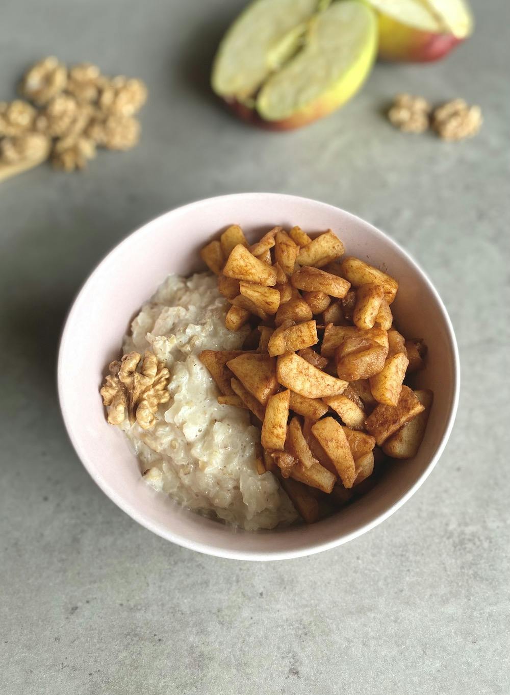 Jesienna ryżanka ze słodkim jabłkiem o intensywnie cynamonowym smaku. Ciekawym przełamaniem aksamitnej konsystencji płatków ryżowych są chrupiące orzechy włoskie. Najlepiej smakuje podana na ciepło. Posiłek może znaleźć się w diecie: w ciąży, w tężyczce, redukcyjnej, bezglutenowej, wegetariańskiej oraz przy nadciśnieniu tętniczym.